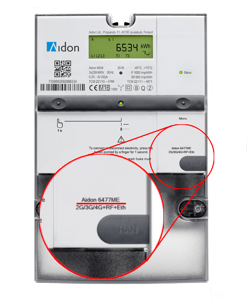 1) On Aidon meters, the model numbers in the table is not the model number of the meter itself, but the model of the communication module located close to the cable socket, see below.